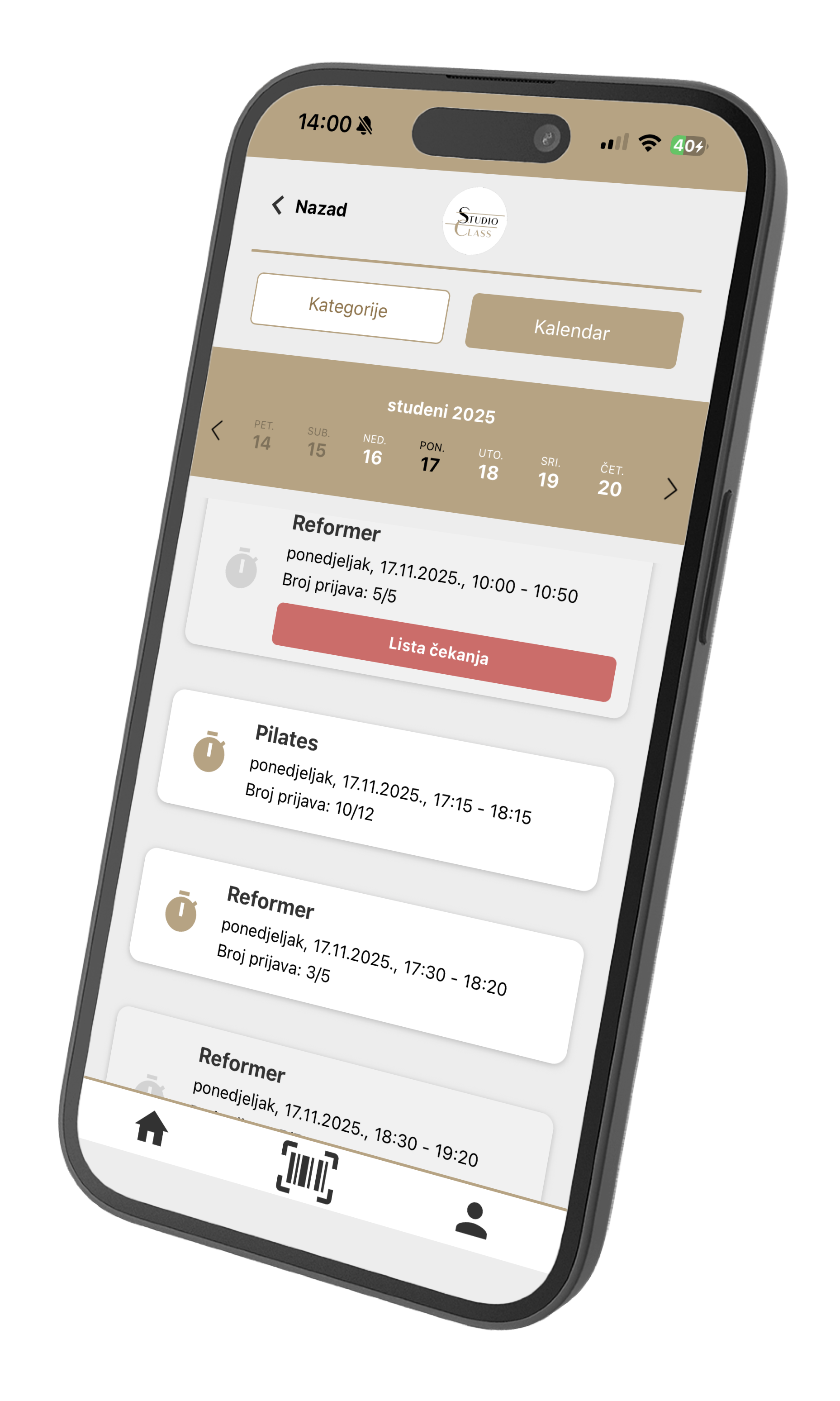 Aplikacija je izrađena tako da korisnik u svakom trenutku zna gdje se nalazi i što treba napraviti — bilo da želi rezervirati termin, obnoviti članarinu ili provjeriti svoj raspored. Svi ključni elementi su optimizirani za brzinu, a navigacija je jednostavna i razumljiva čak i korisnicima koji nisu tehnološki napredni. Studio zadržava svoj vizualni identitet, a klijenti dobivaju moderno iskustvo koje ih potiče na povratak i redovito korištenje.